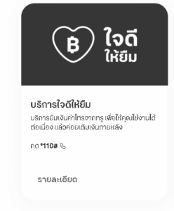 - ผ่าน USSD: กดรหัส คือ *110*ยอดเงิน# หรือ *110# (สำหรับขอยอดยืมสูงสุด) เพื่อกดยืมเงิน